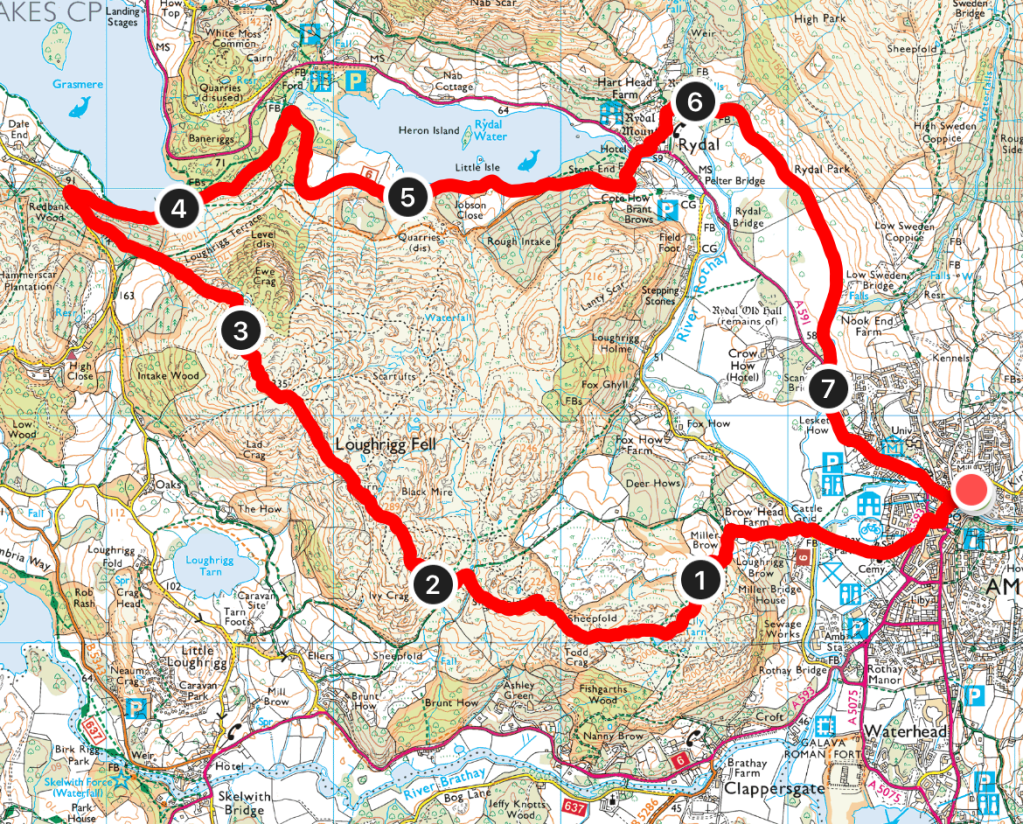 A walk across the Loughrigg fells, there are many variations on this route and this is our favourite, with a good mix of hills, lakes and river. It is possible to cut this short and get a bus from Grasmere if things do not go to plan!